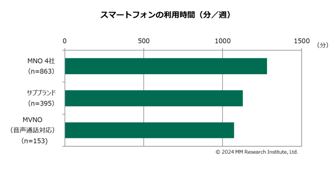 スマートフォンの1週間あたり利用時間※18,19は1,215分(20時間15分)となった。個別にみると、MNO 4社は1,280分、サブブランドは1,128分、MVNOは1,071分となった。
