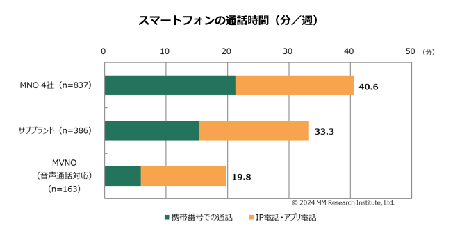 1週間の通話時間はMNO 4社 40.6分、サブブランド 33.3分、MVNO 19.8分