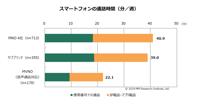 1週間の通話時間はMNO 4社 40.9分、サブブランド 38.9分、MVNO 22.1分