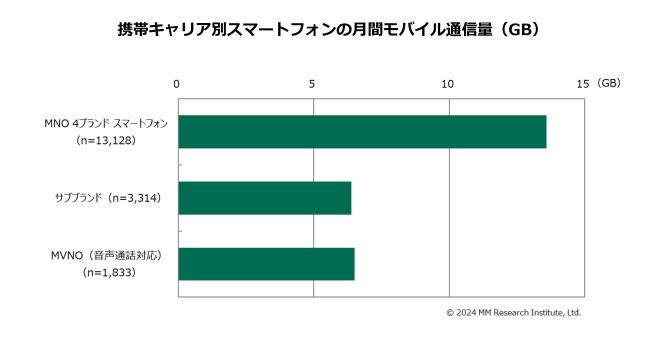 前回調査では、それまで下降トレンドであった月額料金は159円上昇したが、今回調査では113円の微減となった。要因は2023年以降に登場した各社の新プランへの移行が加速したためと分析。新プランではデータ通信量1GBあたりの料金が従来プランよりも安くなったが、月間データ通信量は平均で11.47GB(前回比0.39GB増)にとどまっている。つまり、データ通信量の増加が通信料単価の値下げ分を上回るほどの規模になっていないためと分析する。今後の月額利用料は新料金プランへの移行が増加するなかで、データ通信量がどれほど増加していくかによって上昇することも、減少することもあるだろう。MM総研ではスマートフォンの利用状況を継続的に分析していく。