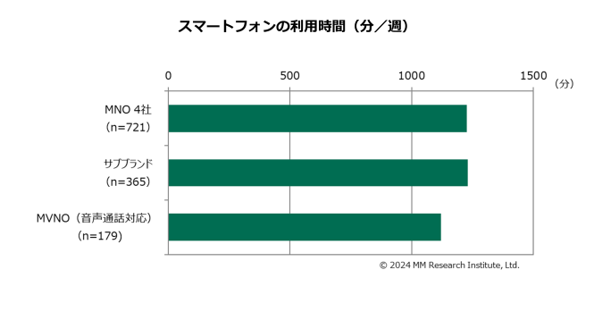 スマートフォンの1週間あたり利用時間※18,19は1,213分(20時間13分)となった。個別にみると、MNO 4社は1,227分、サブブランドは1,231分、MVNOは1,120分となった。